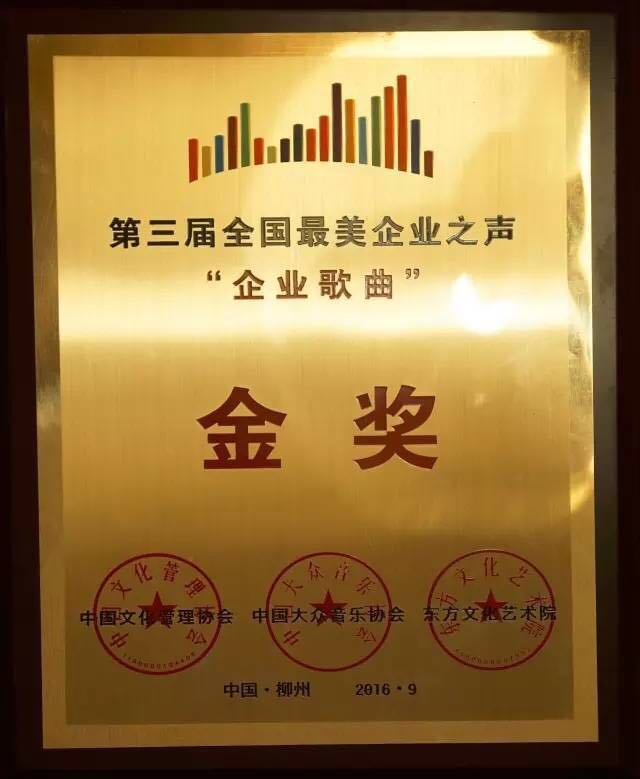 9月28日,2016中國企業文化管理年會暨第三屆“全國最美企業之聲”系列展演活動在廣西柳州隆重召開。公司榮獲中國文化管理協會授予的“企業文化建設標桿單位”稱號。公司選送的原創歌曲《圓夢藍圖》經過專家評審與網絡大眾投票,榮獲第三屆“全國最美企業之聲”金獎并參加現場展演。